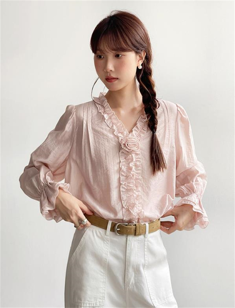 レディース キュート風 長袖ブラウス 春トップス フリル刺繍デザイン |