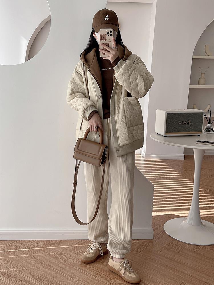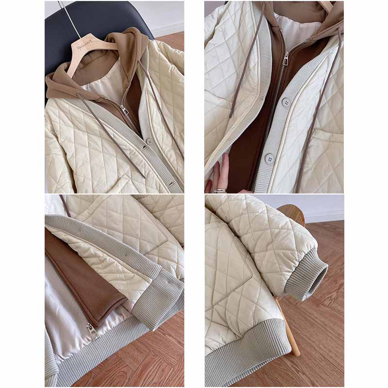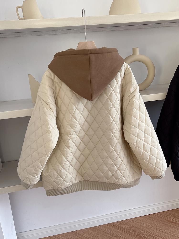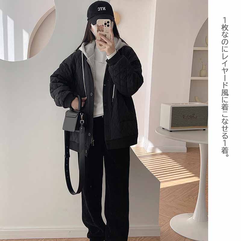 カラー違いのフードつき中綿キルティングジャケット・1枚なのにレイヤード風に着こなせる1着。・首元に当たる生地はソフトで肌ざわりが良い。 ・カラー違いのフードがアクセントに◎。 ・軽量なのに中綿が入っているので暖かい。 ・両ポケットがあり実用的。 |