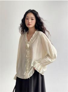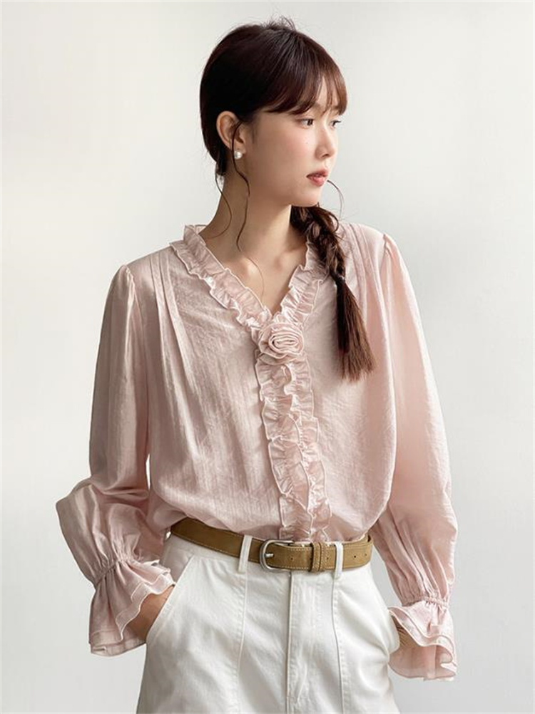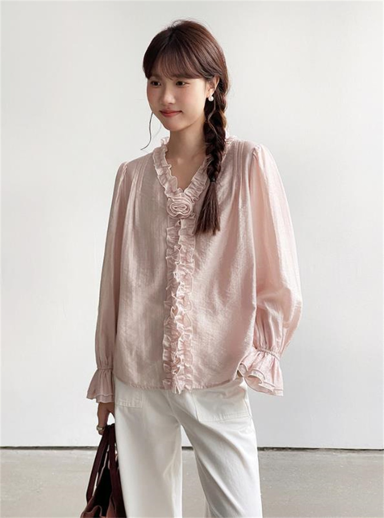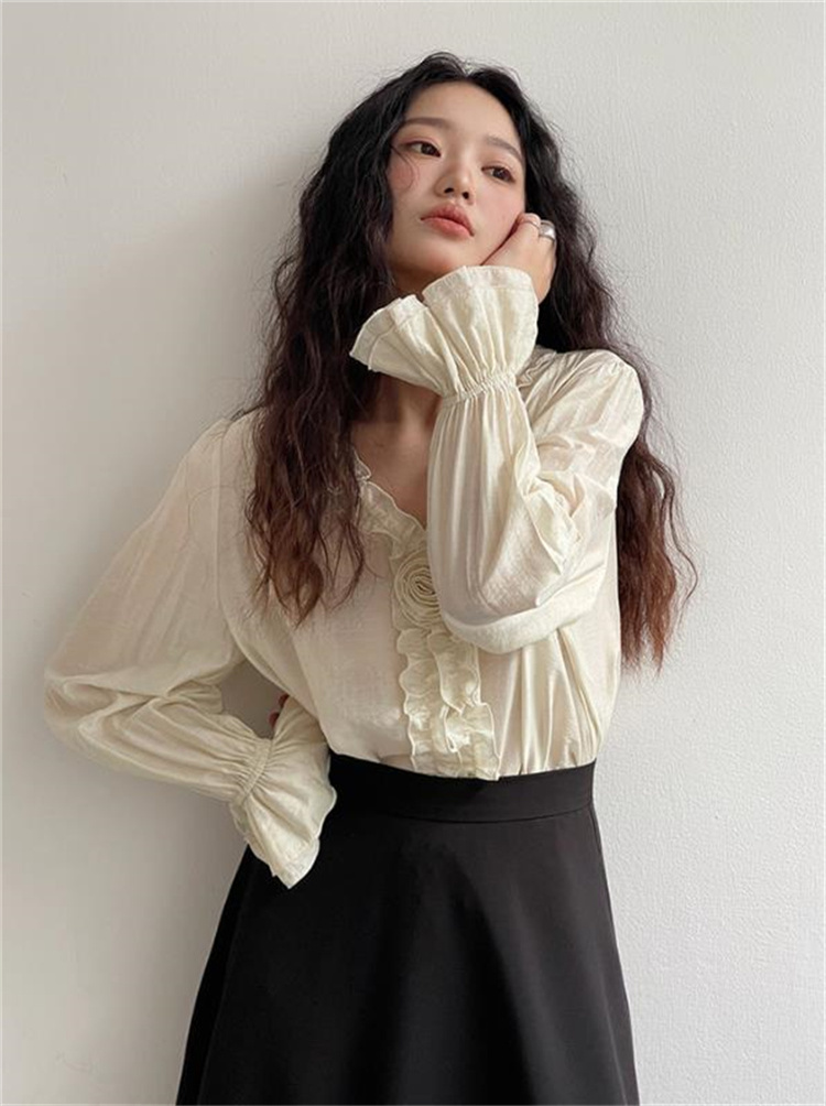 レディース キュート風 長袖ブラウス 春トップス フリル刺繍デザイン |